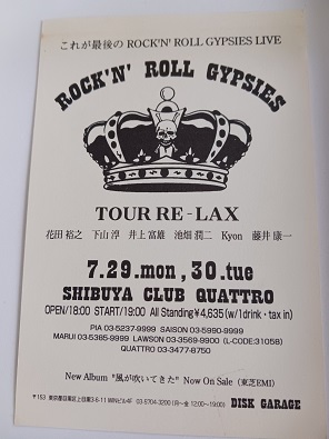 花田裕之 & ROCK'N'ROLL GYPSIES TOUR RE-LAX 7.29&7.30 渋谷クラブクアトロ ![]() (画像提供:さんちゃんさん。ありがとうございます。よく読むと「これが最後のROCK'N'ROLL GYPSIES LIVE」と書いてあり、この時点でロックンロール・ジプシーズをやめることを決意していたことがわかります) |