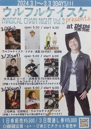 | ・ウルフルケイスケ MAGICAL CHAIN NIGHT VOL.3 2024.03.01~03.03 京都磔磔 (提供:ドクターパイレーツさん。ありがとうございます) |