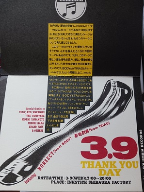 ・さんちゃんさんより情報&画像提供いただきました。ありがとうございます。 こちらは1988年3月9日に行われたコロンビアレコードのコンベンションライブのパンフレットとのこと。ルースターズ、レッド・ウォーリアーズ等が出演とのこと。これまた貴重すぎる一品。 (2024/6/7 追記) |
