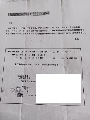 ・さんちゃんさんより情報&画像提供いただきました。ありがとうございます。 1997年2月13日のNHK-FMでのアコースティック・ライブの公開収録の案内。 電話番号、担当者は白塗りとさせていただきました。またこのライブの詳細はこのHPの「ライブの記録 1997年」をご参照ください。 (2024/6/7 追記) |