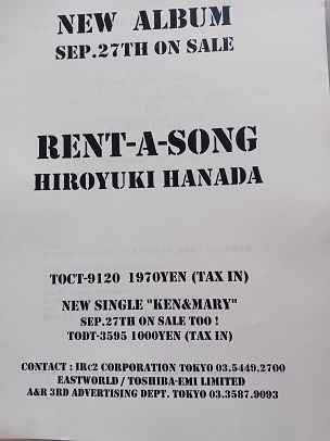 ・さんちゃんさんより情報&画像提供いただきました。ありがとうございます。 なんと「RENT-A-SONG」発売時の東芝EMIの宣伝用資料です。 レコード会社の内部資料ということもあり、アップするのは表紙のみとさせていただきます。しかしめちゃくちゃ貴重すぎる一品。 (2024/6/7 追記) |