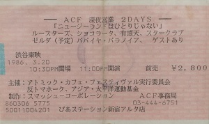 | THE ROOSTERZ 1986.3.20 渋谷・東映「アトミック・カフェ」 「NEON BOY」「SUNDAY」他 (出演) ・エコーズ ・パパイヤ・パラノイア ・スタークラブ ・有頂天 ・ブルーハーツ ・ブルートニック ・ショコラータ ・ザ・花びら(サンプラザ中野&パッパラー河合) ・ショコラータ ・ゼルダ ・ザ・ルースターズ 等 |