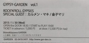 | ROCK'ROLL GYPSIES・'13/01/30 下北沢GARDEN (SPECIAL GUEST=カルメン・マキ、金子マリ) (第1部) 01.LOVE HURT 02.OH! MY GOD 03.只の夢 04.渇く夜 05.そろそろ 06.HONEY BEE 07.Criminal Rock 08.CRAZY ROMANCE 09.Old Guitar 10.黒の女 (下山) (第2部) 11.MUDDY MAN 12.風を追いかけて(with 金子マリ) 13.最後の本音(with 金子マリ) 14.それはスポットライトではない(with カルメン・マキ、金子マリ) 15.Trick Star(with カルメン・マキ) 16.Lilly was gone with windowpane(with カルメン・マキ) 17.Let'em Roll 18.DO THE BOOGIE 19.N.W.O. (下山) (アンコール) 20.I Shall Be Released(with カルメン・マキ、金子マリ) 21.光 |