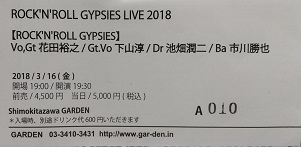 | ROCK'N'ROLL GYPSIES 2018.03.16 下北沢GARDEN 01.TRUCKIN' 02.LOVE HURT 03.CRIMINAL ROCK 04.LAZY SUN 05.そろそろ 06.危険な日常 07.渇く夜 08.只の夢 09.OLD GUITAR 10.You won't be my friend (下山) 11.あきれるくらい 12.Living on the borderland (下山) 13.HONEY BEE 14.空っぽの街から 15.MUDDY MAN 16.Till dawn (下山) 17.LUCKY LOVE (アンコール) 18.黒の女 (下山) 19.I Wanna Be Your Man 20.夢うつつ |