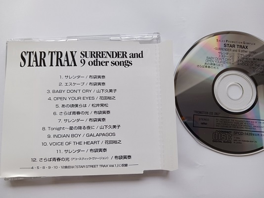 ・さんちゃんさんより画像&情報提供いただきました。ありがとうございます。 V.A.「STAR STRRET TRAX VOL.1」のプロモ用CD。2枚組から収録曲を絞って 1枚にまとめてある。花田さんは「OPEN YOUR EYES」「VOICE OF THE HEART」 の2曲を収録。 このプロモ版のタイトルが「STAR TRAX SURRENDER and 9 other songs」 となっていることから、当時の東芝EMIが強烈に布袋さんを推していたことが わかります。 (2024年5月29日追記) |