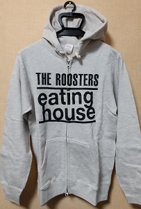 ・パーカー。2013年福岡サンパレスでのTHE ROOSTERSライブの時のもの。後にDVD化されたタイトル「eating house」のロゴ入り。フードの部分にはThe Roostersのロゴあり。 |