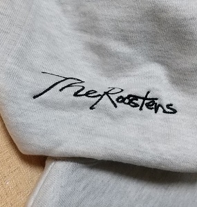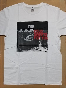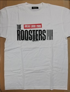 ・2016年のテレビジョンのオープニングアクトでTHE ROOSTERZ復活時のもの。下山さんデザイン。上記のTシャツの右腕のロゴをメインに使用。 |