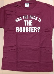 ・99年の「RESPECTABLE ROOSTERS」のライブの時に名乗った「WHO THE FUCK IS THE ROOSTER?」のTシャツ。私はこのTシャツも好きで、一時期ライブでよく着ていた。これは保存用にとっておいたもの。ちなみにこのデザインは元々はキース・リチャーズが「WHO THE FUCK IS MICK JAGGER?」というデザインのTシャツを着ていた有名な写真が元ネタ。 |