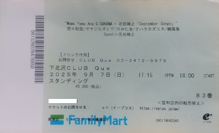 | 花田裕之「流れ」2025.10.25 渋谷CROSSROAD (第1部) 01.風の中に消えた 02.DOWN DOWN 03.汽笛が(山口富士夫) 04.時は流れて(柳ジョージ) 05.MY MY, HEY HEY(OUT OF THE BLUE)(NEIL YOUNG) 06.ロックンロール・ジプシーのバラッド 07.魅惑の宵(サンハウス) (第2部) 08.いつか見た夢 09.夢見るボロ人形(サンハウス) 10.SADNESS CITY 11.汽車はただ駅を過ぎる 12.花・太陽・雨(PYG) 13.祭り囃子が聞こえるのテーマ(柳ジョージ) 14.UNHAPPY GIRL (アンコール) 15.泣くだけ泣いたら(萩原健一) 16.にわか~雨(サンハウス) |